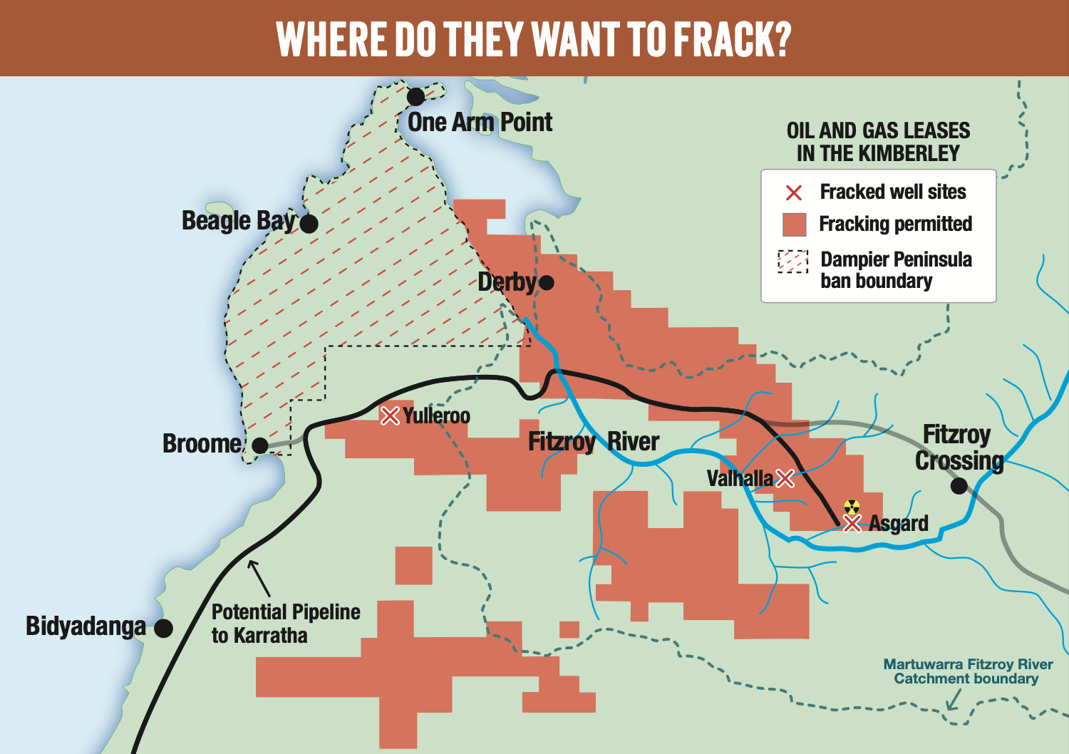 The map shows the petroleum lease areas in the Kimberley where fracking is permitted under Cook government policy, showing an industry proposed gas export pipeline route to the Pilbara, past test fracking sites, key towns and the Fitzroy Martuwarra River.